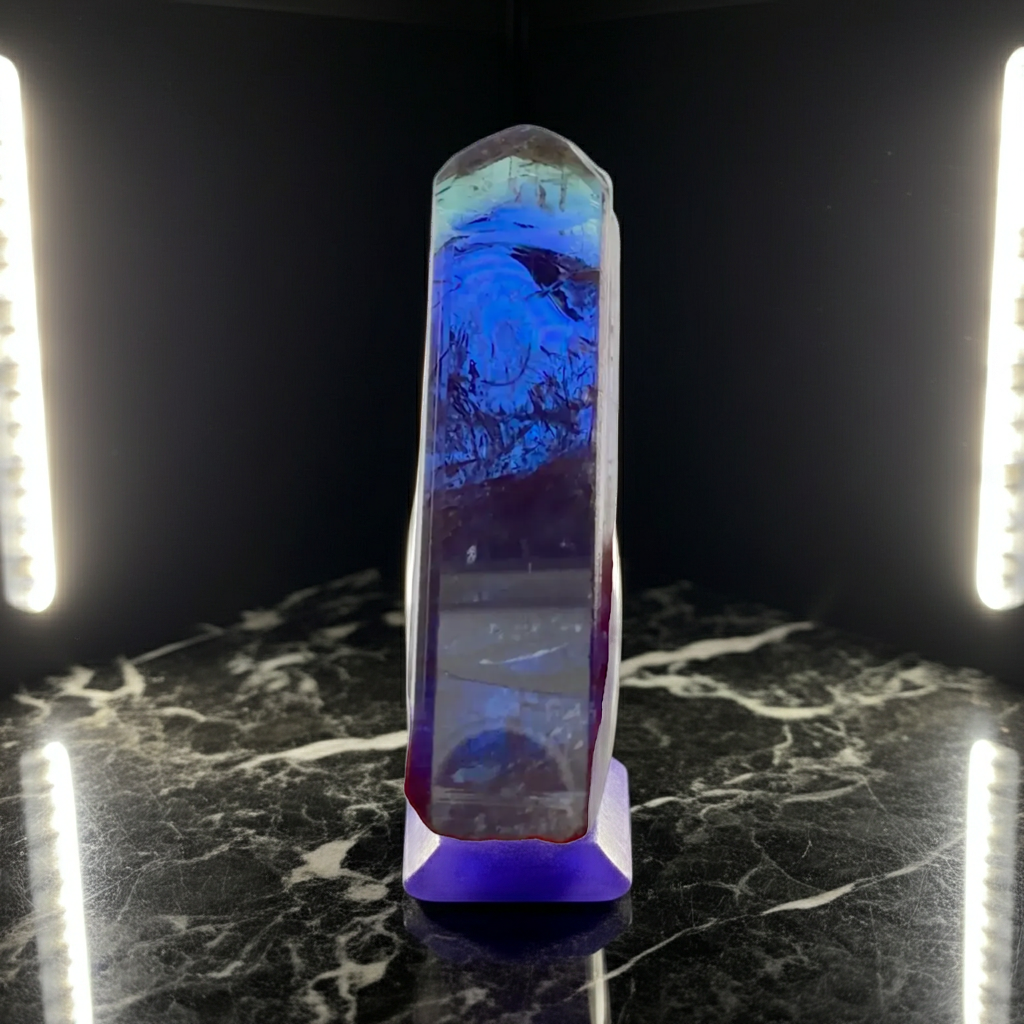 Beautiful tower tanzanite with solid blue main face and a twin side purple face. This tanzanite has a second growing into it with 0 damage anywhere on this very lustrous crystal!